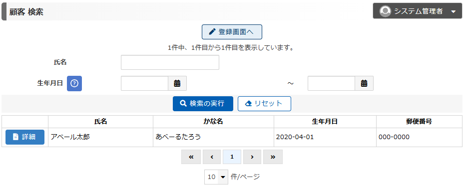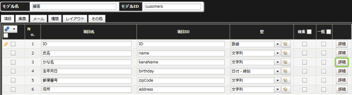 今回は、一覧画面に表示する項目は「氏名」「かな名」「生年月日」「郵便番号」の4つ、検索できる項目として「氏名」「生年月日」の2つを設定していきます