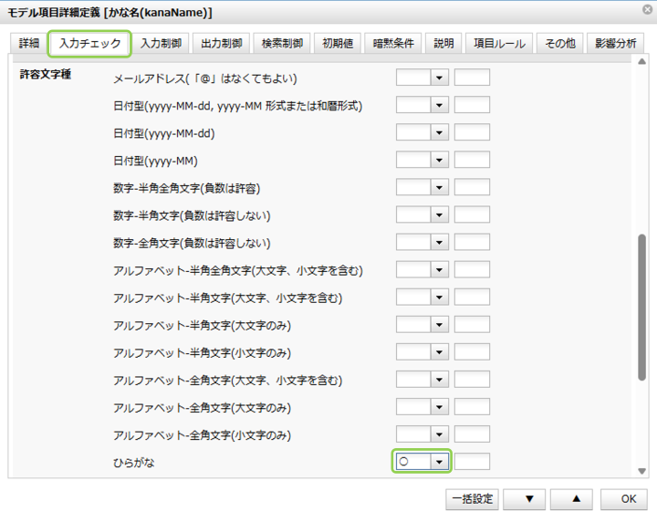 次に、「入力チェック」のタブに移動し、許容文字種から「ひらがな」の欄にあるリストで、「〇」を選択しOKをクリックします