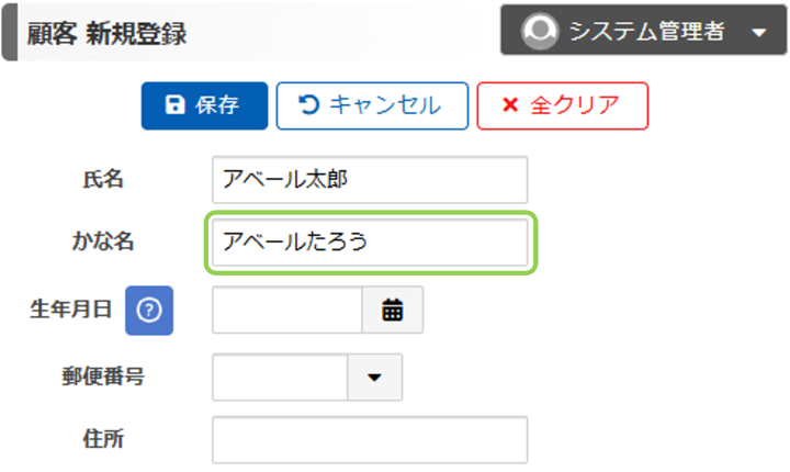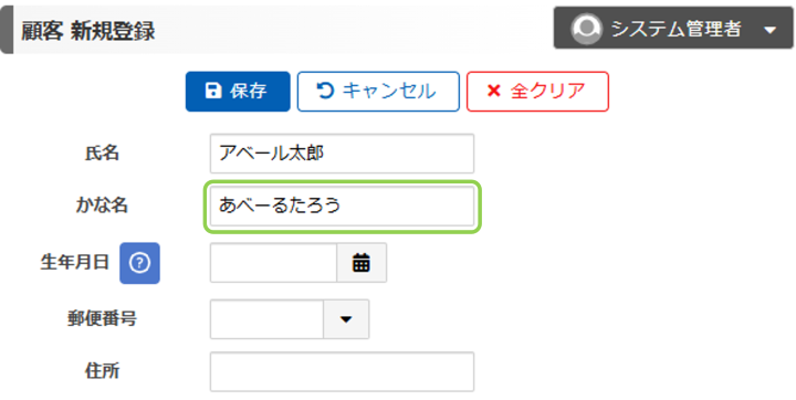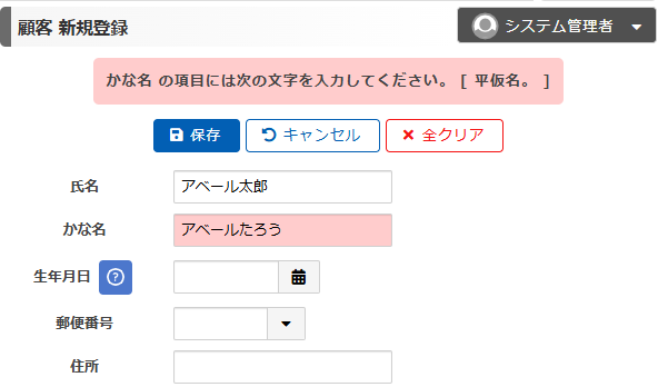 「保存」ボタンを押すと、かな名にひらがな以外の文字が入っている旨のメッセージが表示され、保存ができないようになっています