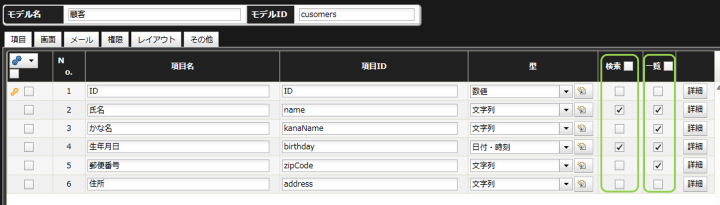 検索画面や一覧画面に表示したい項目を設定する場合は、モデルの項目一覧から設定します