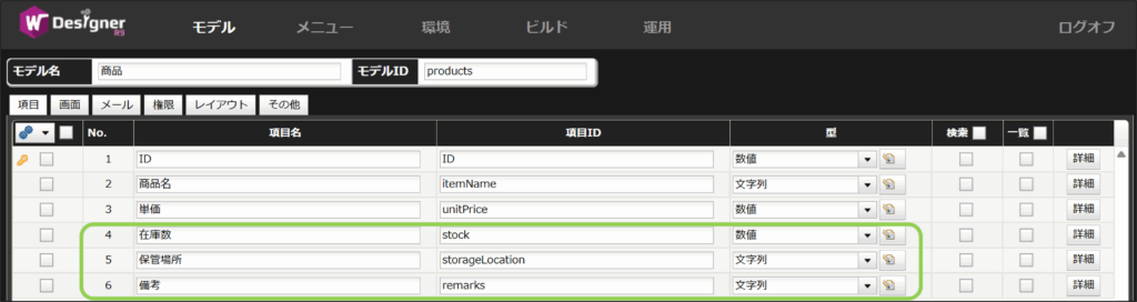 例として、商品モデルに在庫数、保管場所、備考を追加します