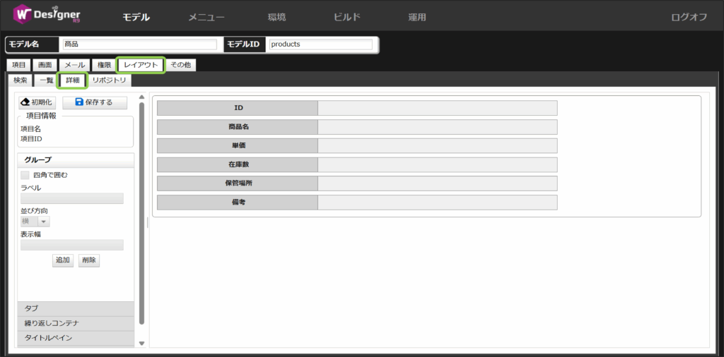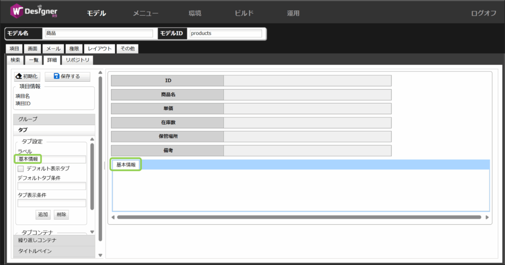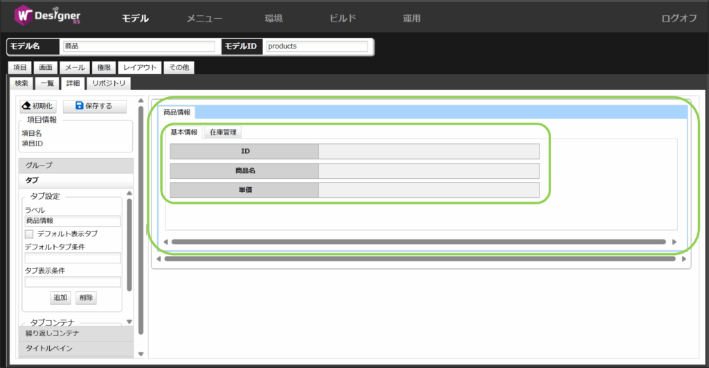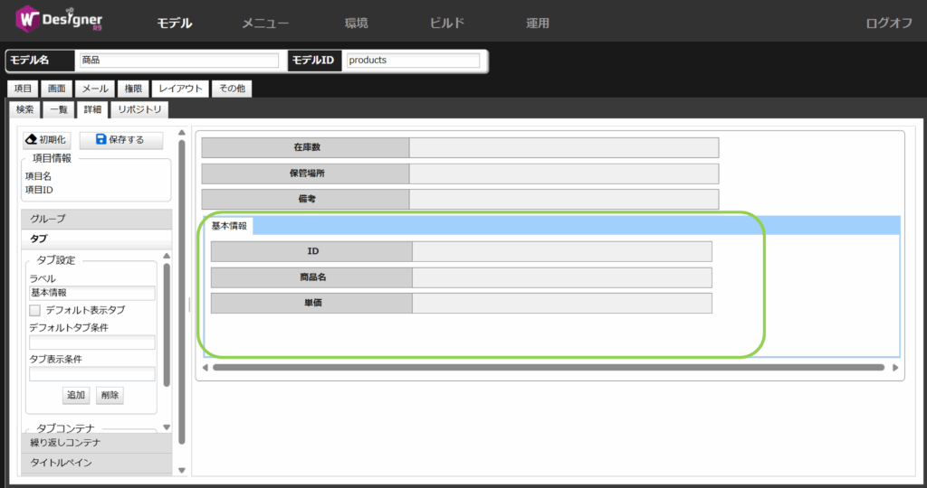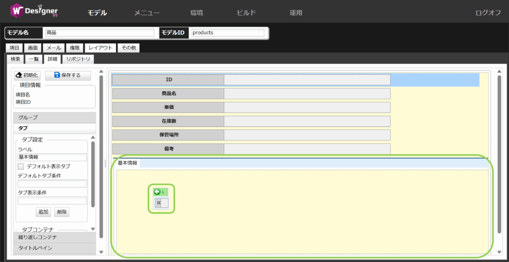 今回は基本情報タブにはID、商品名、単価を配置します