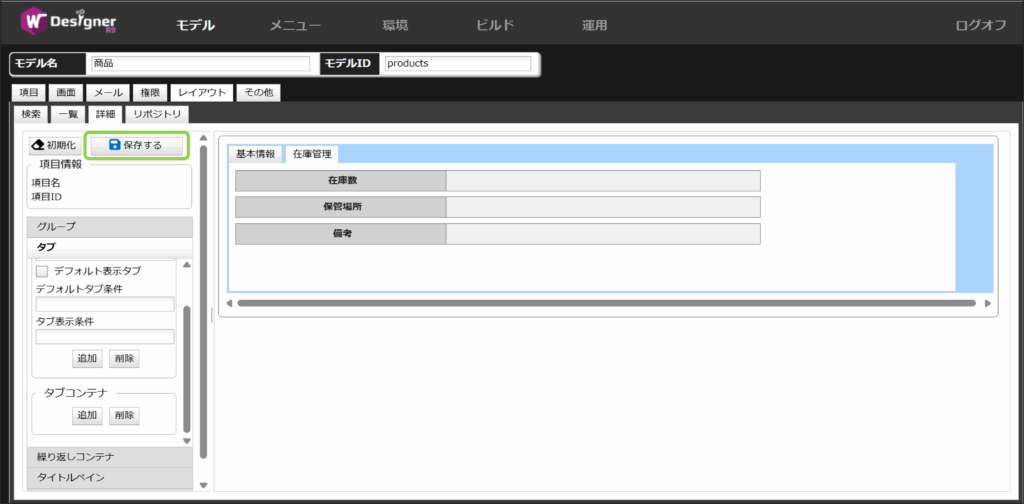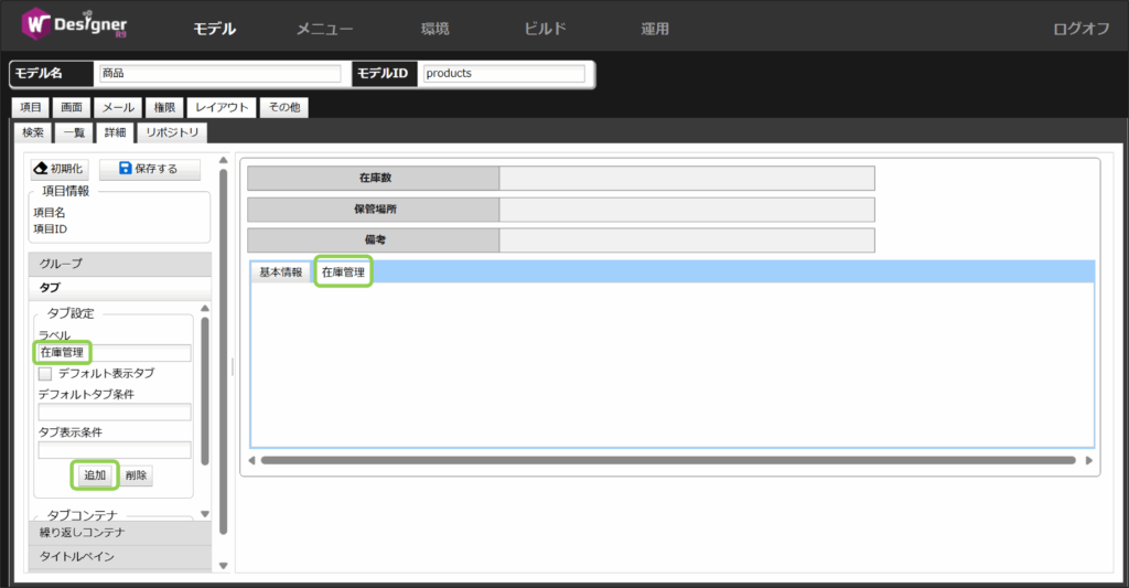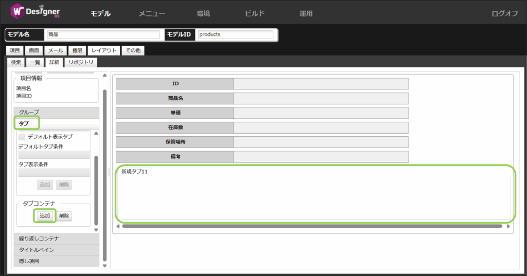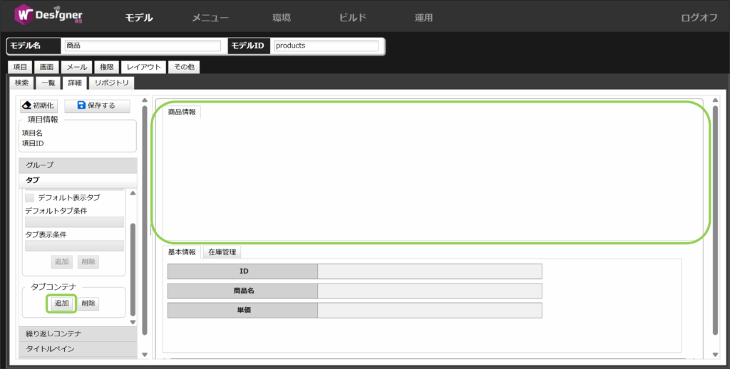 タブコンテナの中にある「追加」を押下して、タブを追加します。今回はタブ名を「商品情報」に設定します