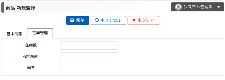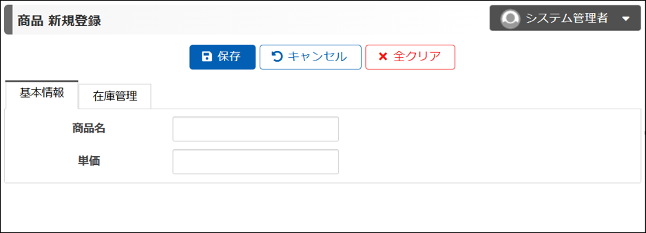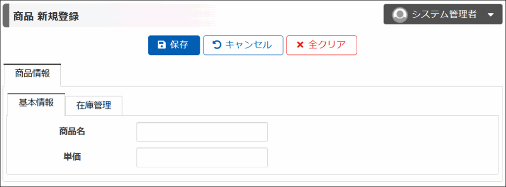商品の新規登録画面を見てみましょう。2つのタブで項目をグループ分けすることができました