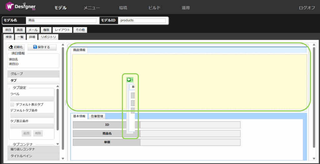 基本情報タブと在庫管理タブのまとまりを、ドラッグアンドドロップで商品情報タブの中の配置します