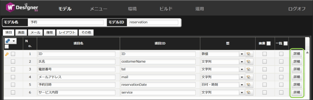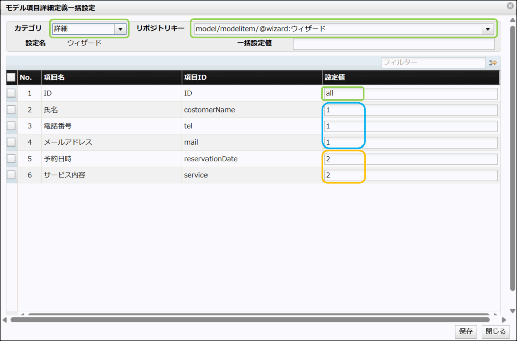 次に各項目の詳細からモデル項目詳細定義を開き、ウィザード画面番号を設定していきます