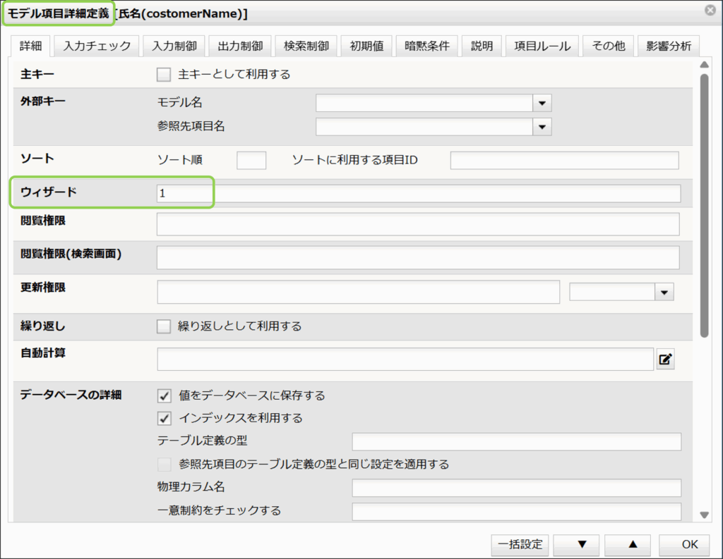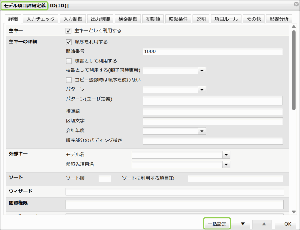 ウィザード画面番号は一括設定することもできます。モデル項目詳細画面から「一括設定」を押下します