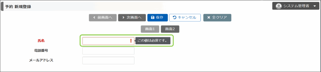 なお、氏名を必須項目に設定しているため、氏名を入力せずに画面2に進むことはできず、エラー表示が出ます