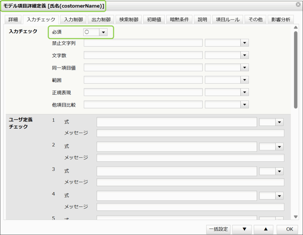 氏名項目の詳細画面を開き、入力チェックタブにある必須項目をプルダウンで「〇」に設定します