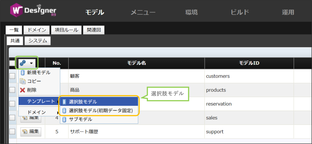 始めに、モデル一覧画面からテンプレートを新規作成していきます
