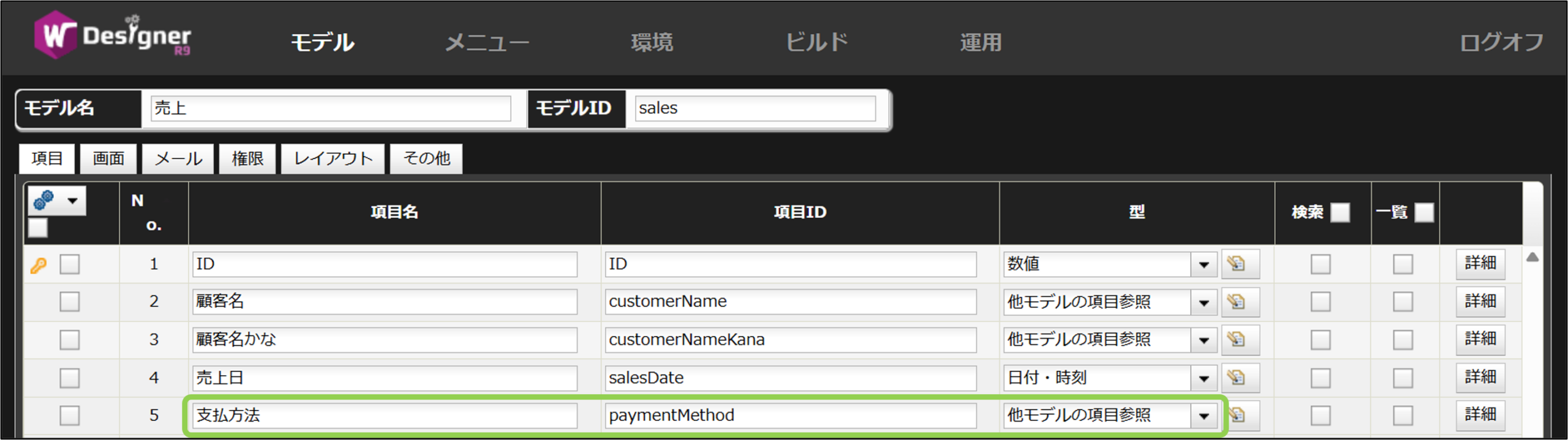 モデル一覧画面に戻り、売上モデルに「支払方法」の項目を新規作成します
