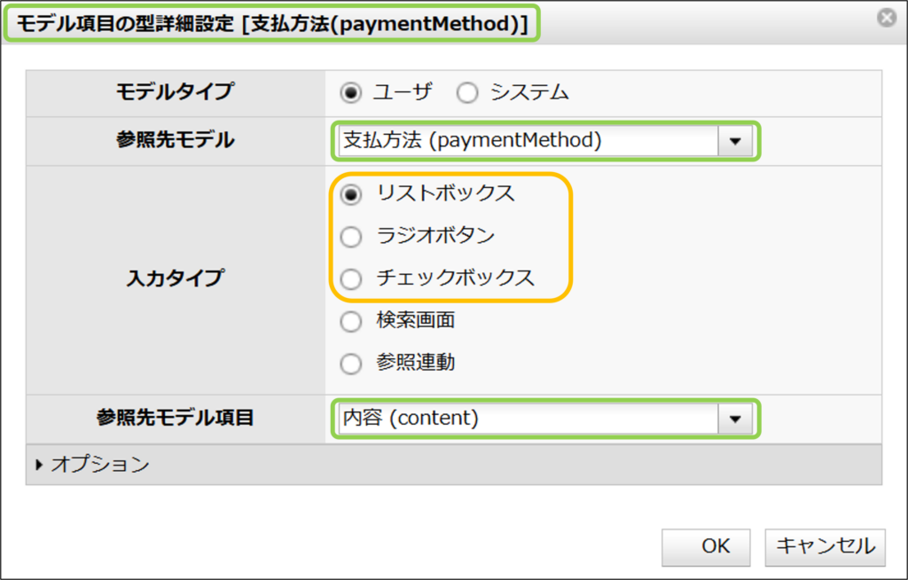参照先モデルに、先ほど選択肢モデルとして作成した「支払方法」を指定します