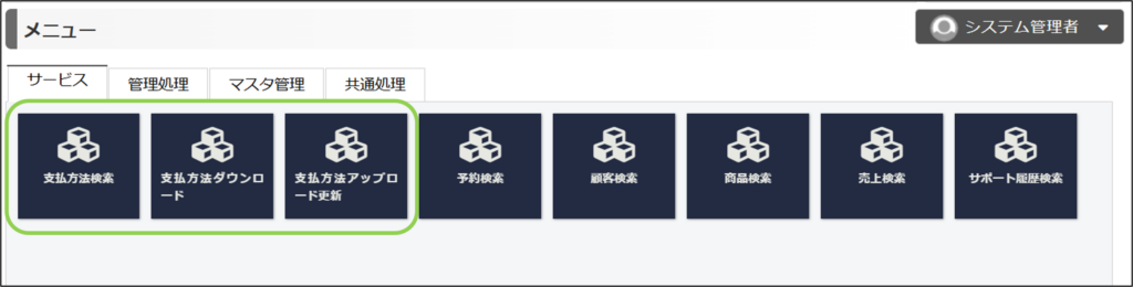 メニューに支払方法の検索ボタン、ダウンロードボタン、アップロード更新ボタンが追加されています