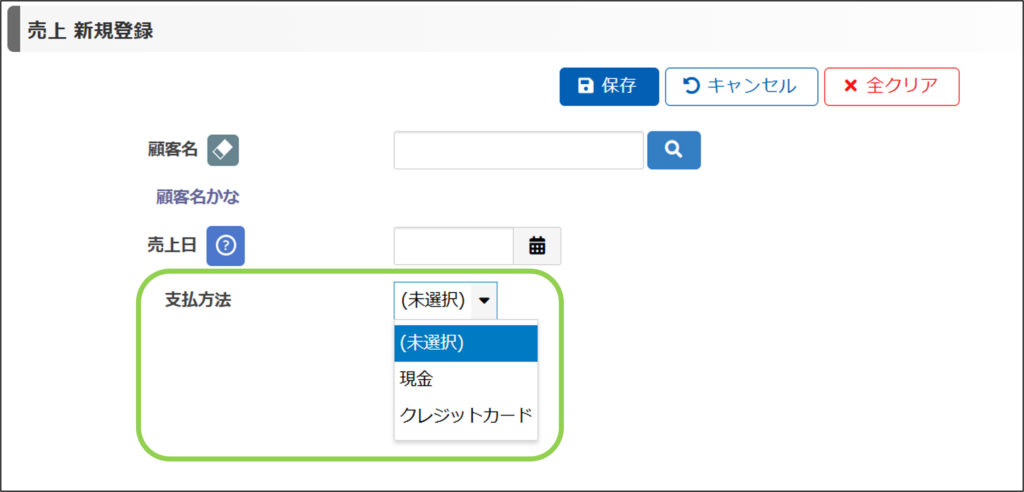 売上モデルで「支払方法」の項目を選択式で入力できるように設定をします