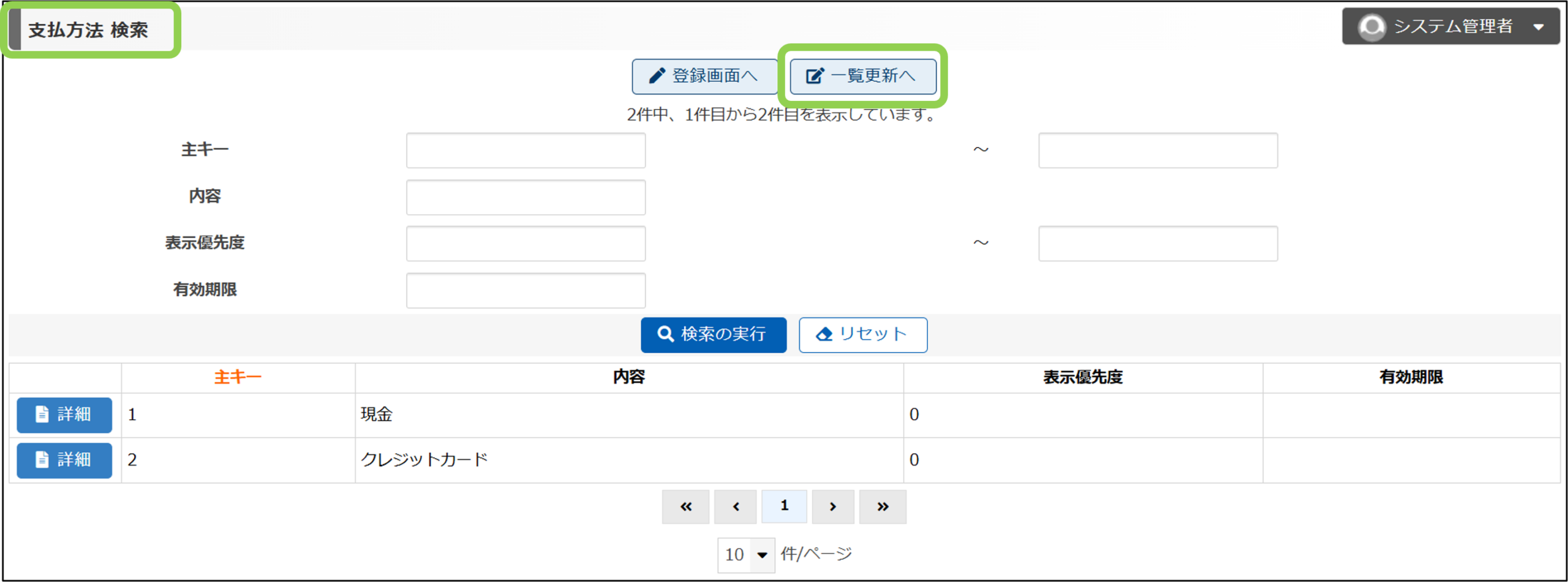 メニューに戻り、支払方法検索>「一覧更新へ」を押下します