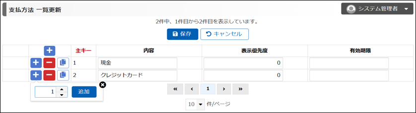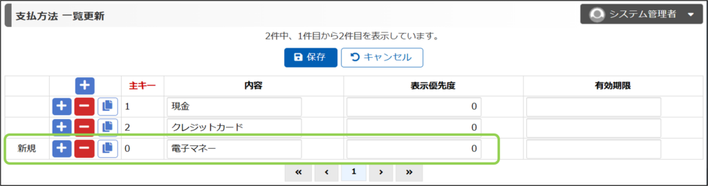 「+」ボタンで行を追加し、「電子マネー」を追加してみましょう。追加ができたら、保存ボタンを押下します
