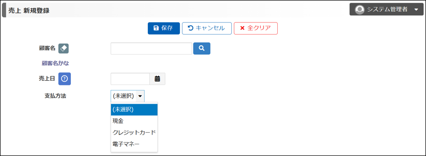 売上の新規登録画面で、支払方法に電子マネーが追加されました